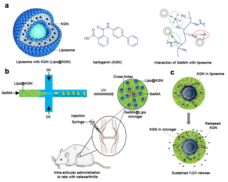 该团队通过微流控技术和光化学交联反应,一步法制备了单分散、粒径均一、携载小分子有机化合物kartogenin (KGN)的可注射明胶基水凝胶微球。利用水凝胶分子网络的包裹及水凝胶和脂质体间的非共价结合,将装载KGN的脂质体紧紧锚定于水凝胶微球中,构建了稳定的水凝胶微球“双重缓释”体系,实现对KGN的缓释。