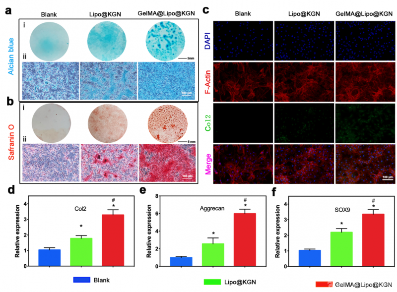 图2.携载KGN的水凝胶/脂质体复合微球促进干细胞的成软骨分化
