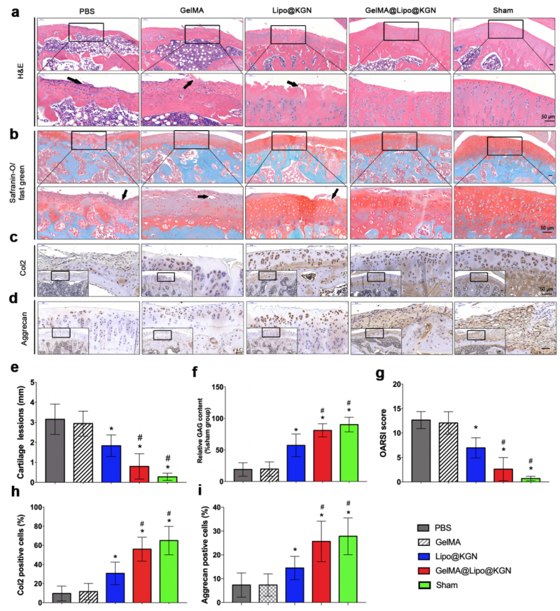 图3.携载KGN的水凝胶/脂质体复合微球治疗大鼠骨关节炎的组织形态学分析