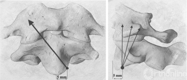 迄今已有数种可用的不同的螺钉置钉轨迹的报道[2,4,6]。生物力学研究表明,该种技术具有足够的固定强度,可与后路融合技术相媲美[3,5]。未见手术相关的并发症的文献报道。对侧螺钉固定技术允许将螺钉放置在比皮质层深2-3毫米的C2椎体内,而Reindl[2]和Koller[4]所描述的技术将螺钉在大范围皮质下置入。在C2椎体内更深的位置的螺钉可能更加稳定,然而,这一结论还没有被生物力学研究证实。