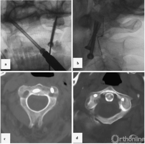 在双平面x线引导下,将K-wire穿过C2椎体下边缘并插入寰椎对侧侧块(图3a),并用其钻通骨隧道。在骨隧道中插如一根空心皮质内固定螺钉(直径4mm,长度38mm),螺钉头在C2椎体的位置有利于左侧关节的Reindl固定。然而,C2双侧侧块明显变薄(CT数据;图1,右)使得我们无法实施这种方法。