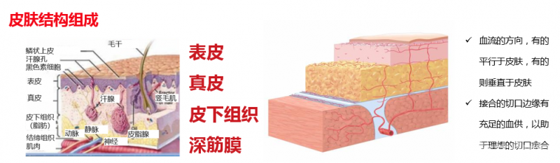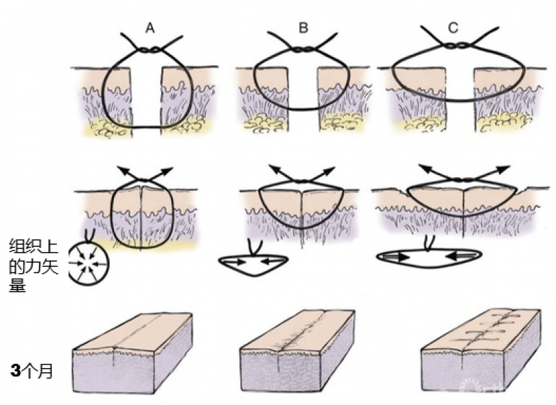 因为,切口平整虽然可以实现良好的对合,但不会产生过大的张力。随着伤口愈合,可引起轻微内翻和收缩,导致形成扁平瘢痕。在缝合过程中,皮肤边缘卷曲,趋于进一步内翻,可导致愈合不良和外观不佳。