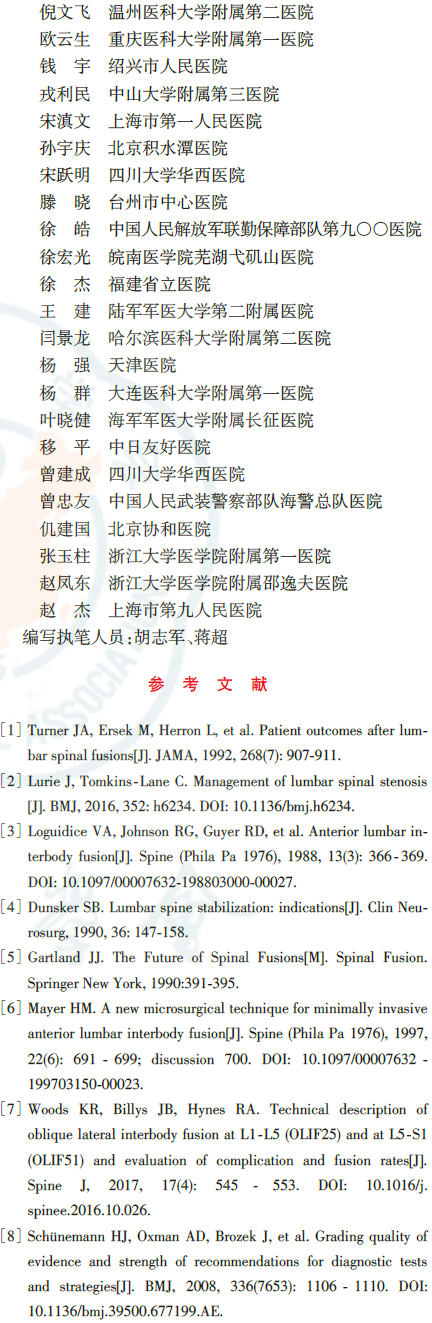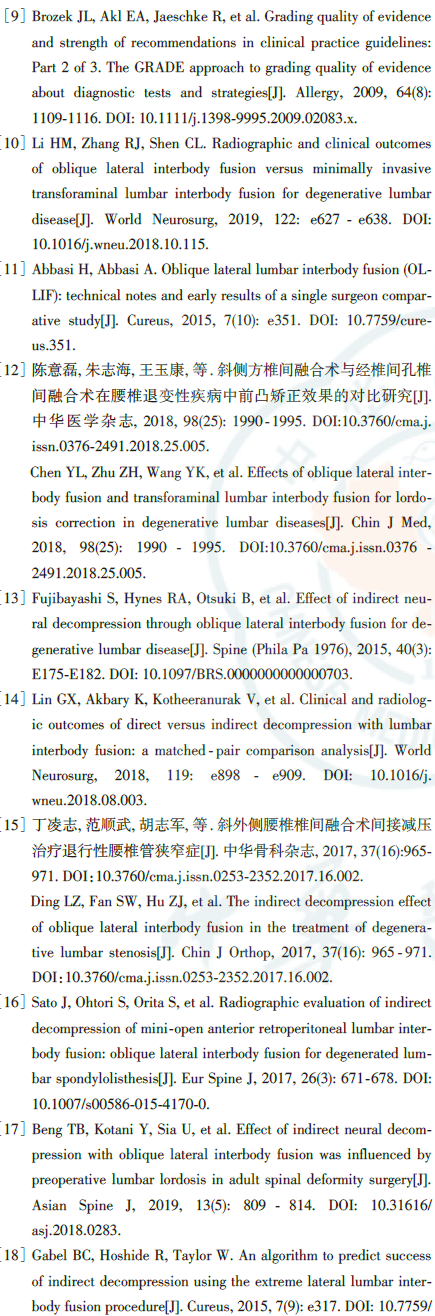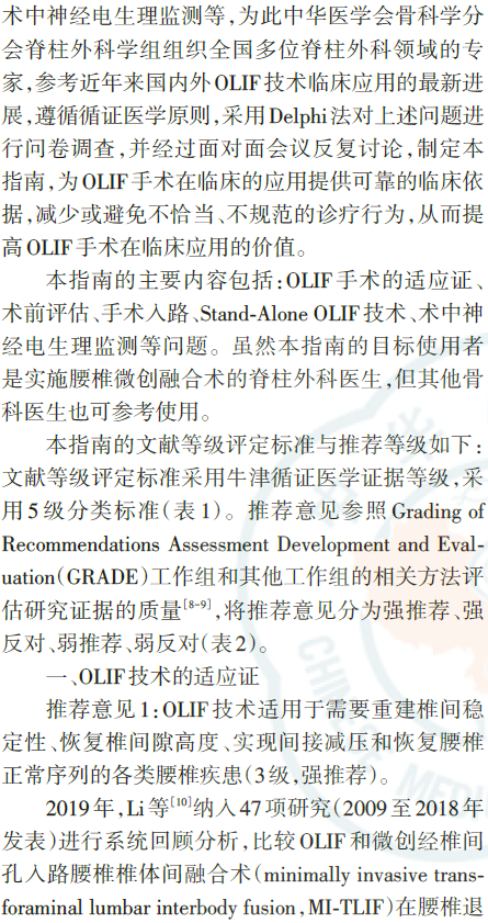 腰椎斜外侧椎间融合术(oblique lateral interbody fusion, OLIF)是国际热门的腰椎微创新技术,自2014年引进中国大陆,目前已在全国范围内广泛开展。然而,OLIF技术临床应用仍有诸多争议和有待规范的问题存在,包括手术适应证、术前评估、手术入路、融合器放置位置、不加内固定的单纯OLIF技术应用(Stand⁃Alone OLIF)和术中神经电生理监测等。腰椎斜外侧椎间融合术的临床应用指南旨在通过循证医学的方法,统一及规范上述问题,为OLIF技术的临床应用提供可靠的临床依据,减少或避免不恰当、不规范的诊疗行为,从而提高OLIF手术在临床应用的价值。