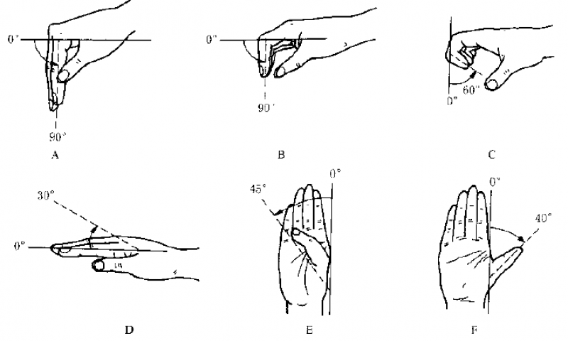 A.掌指关节屈曲;B.近节指间关节屈曲;C.远节指间关节屈曲;D.掌指关节背伸;E.拇指掌指关节内收;F.拇指掌指关节外展