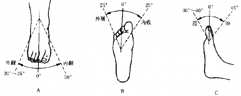 1.足内、外翻活动只要在胫距关节内翻30°,外翻30°-35°。
