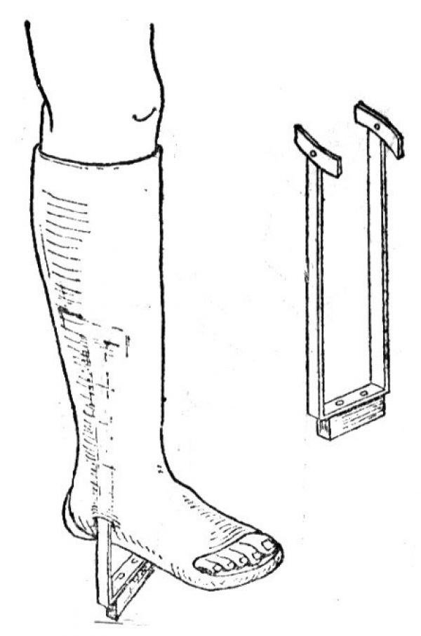 在石膏绷带尚未干固之前,用手鱼际塑形足弓,待石膏硬固后,再修剪边缘,将衬里外翻固定,两端开口处边缘光滑,不致磨擦皮肤。如果需要带石膏靴走路者,可在管型石膏上加一走铁(图2)。