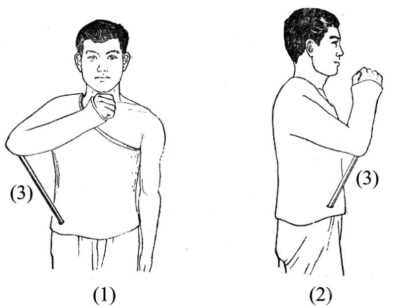 先将3~4层石膏条带从肩后、肩上、肩前环绕肩部至上臂及肘部,躯干胸背周围,髂前上棘也要石膏条带加强。然后用石膏卷缠绕4~5层,用手抚平石膏外层。为了减轻石膏重量防止肩部下沉,可在肘部与髂前上棘之上加一木棍支撑〔图1(3)〕。