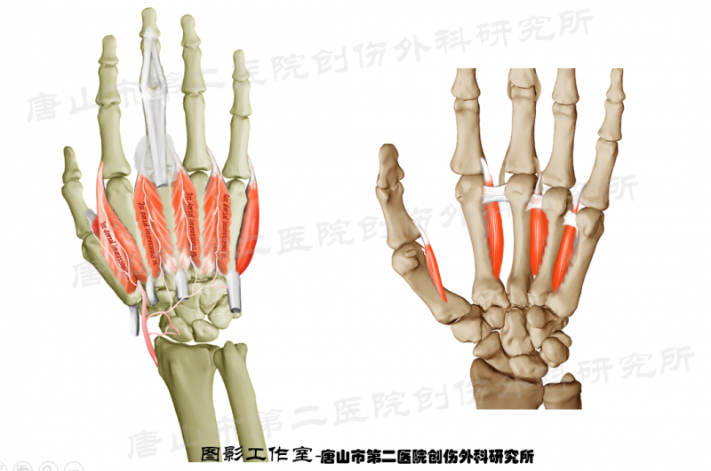 骨间掌侧肌和骨间背侧肌均起自掌骨间,位于掌骨间深横韧带背侧,骨间掌侧肌为单羽肌,止点为靠近中指侧近节制骨基底,作用为收拢手掌用于抓握,细小的第一骨间掌侧肌出现率97.6%。骨间背侧肌止点相反,为远离中指的近节制骨基底一侧,帮助手张开去抓握。