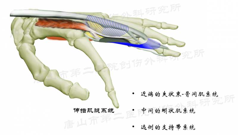 腱膜的主体是指伸肌腱,沿途加入骨间肌、蚓状肌和支持韧带纤维。