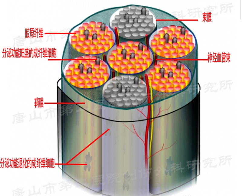 肌腱的内部结构由肌腱纤维束平行排列并有所交联,束膜包裹纤维束,纤维束间存在动脉、静脉、淋巴和神经支配,纤维束外包裹鞘膜,通过显微结构理解功能指导治疗。