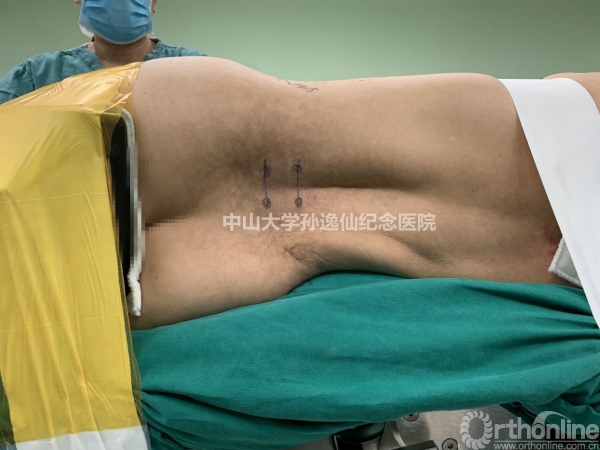 图3:侧卧位固定及椎弓根影标记