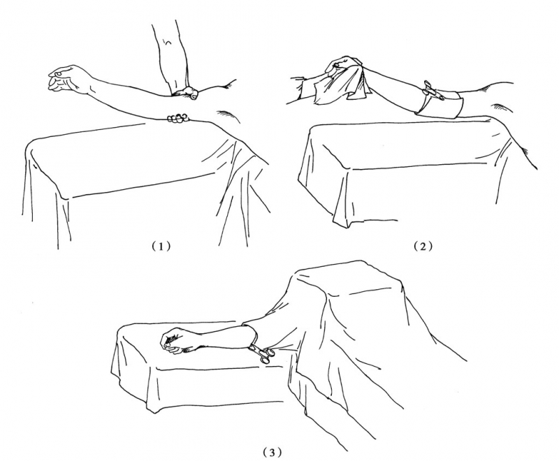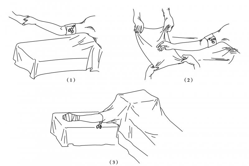 (1) 抬高患肢,肘上用无菌巾包裹一周;(2)用无菌单包裹手、腕;(3)铺剖腹单