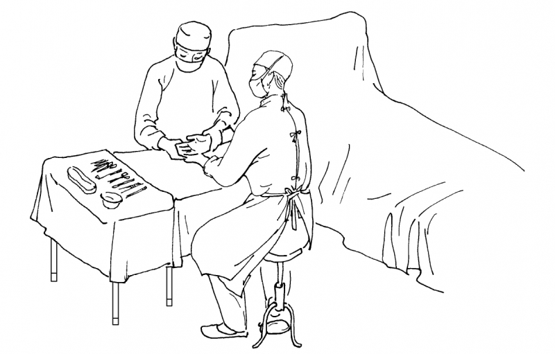 患者仰卧,由一巡回护士自手腕部抬起外展的上肢。皮肤灭菌后,用一双层中单自腋下和胸侧壁铺在手术台旁的小桌上。