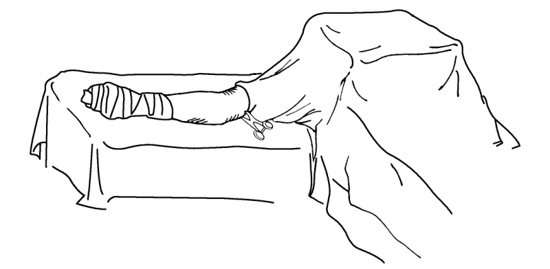 ②手术者和助手同时提起对折的手术巾的四角,托着巡回护士放下的手,放在手术台旁的小桌上。用对折的手术巾包裹手和腕部,并用绷带包扎。