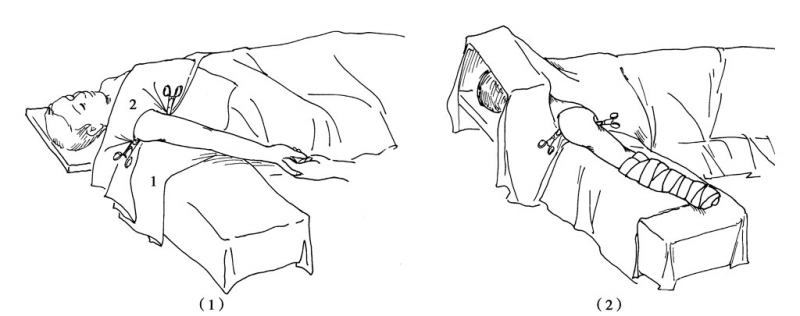 患者仰卧:①由巡回护士握住患者的手,抬高患肢。皮肤灭菌后,用两边对折成长条状的手术巾包绕上臂时,应在肘上6~8cm处包裹上臂和止血带,并用巾钳固定。