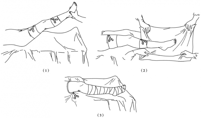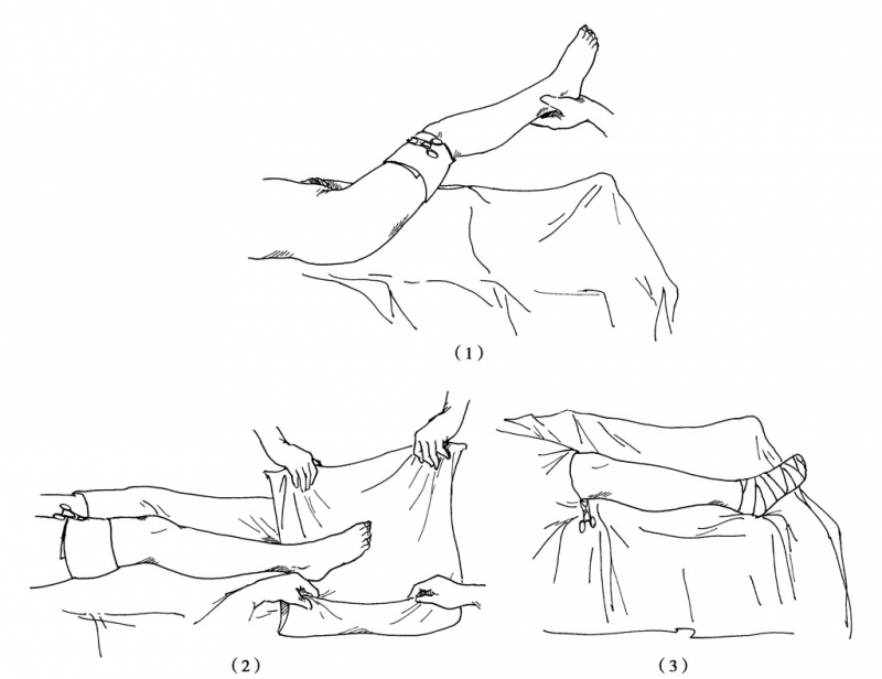③手术者和助手分别提起一条两头对折的中单的四角,托住巡回护士放下的下肢,放在手术台上,而后包裹膝部、小腿和脚,并用绷带包扎(图2-3-19(2)(3))。