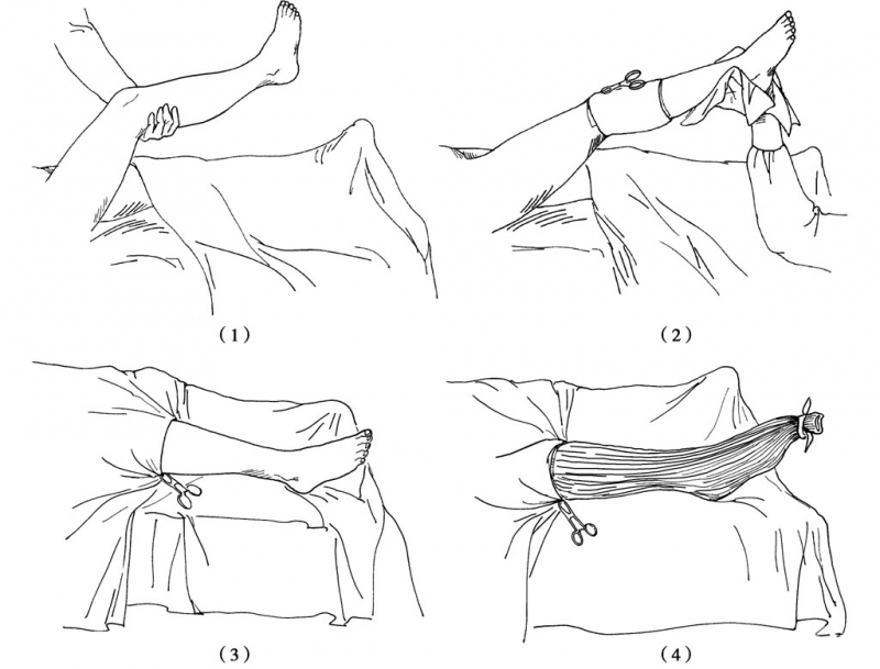 (1)抬高患肢;(2)用无菌巾托起患侧踝部;(3)铺剖腹单;(4)套入棉织套