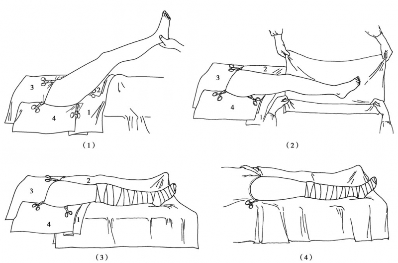 (1)髋部铺无菌手术巾;(2)、(3)包裹足及小腿;(4)铺剖腹单