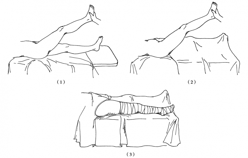由巡回护士执握患肢踝部抬高患肢,或用下肢架架高患肢(图2-3-23(1))。