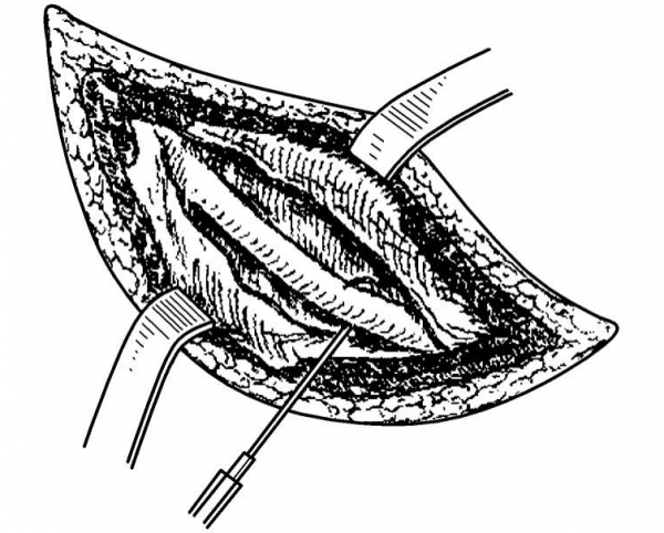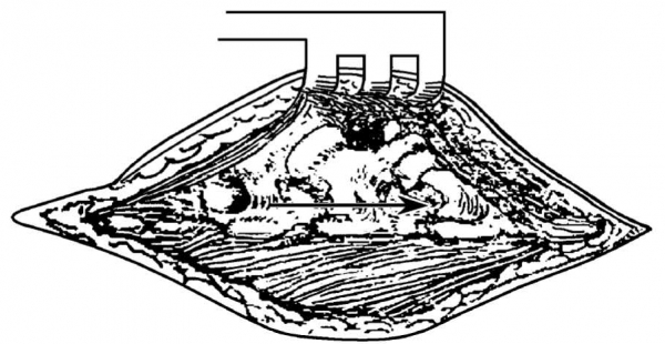 在具体的手术操作过程中,剥离骨膜时应使骨膜剥离器向骨间膜或肌纤维与其附着的骨干成锐角方向剥离、推进,否则易于进入肌纤维或骨间膜纤维中,造成出血和对组织的损伤(图3-1-1)。