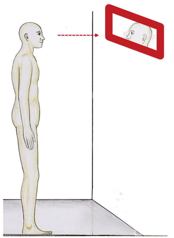 为了获得可重复的图像,对于患者的站姿有严格的要求。如果患者不存在矢状位失平衡,则要求膝关节伸直状态。头部的位置是由前方的镜子调控的。在镜子里,受试者可以看着自己的眼睛(图3-27)。