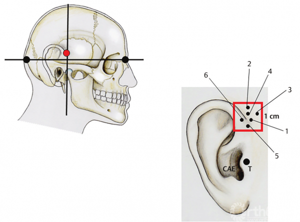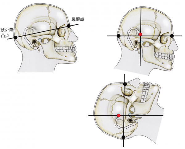 Vital和Sénégas[18]经过深入研究,确定了颅骨的重心。应用悬吊法测量6具尸体标本,男、女各3具,重量在3.671~5.213g,头颅指数为72(长颅型)~85(短颅型)。Gardner钳的穿刺点位于耳廓上方1cm2的区域。影像学上,重心的中点落在鼻根-枕骨隆凸(枕外隆凸)连线上,较蝶鞍偏后一点,外耳道(EAC)的正上方(图3-28至图3-31)。