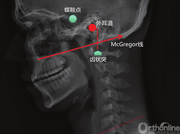 ● 枕骨至C2角,由McGregor线和一条通过C2下终板的直线构成的夹角。在评估枕骨至C1关节和C1~C2关节时非常有帮助。