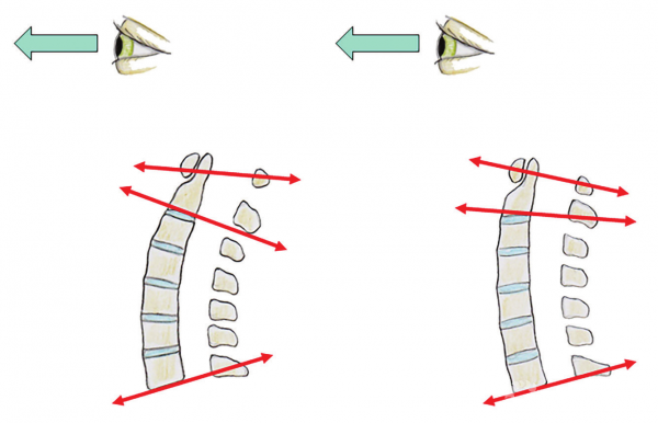 总的来说,下颈椎前凸角度(C3~C7)比上颈椎(C1~C2)前凸角度小得多,这很大程度上取决于C7倾斜角。为了保持视线水平,上颈椎脊柱像一个倒立的钟摆,它的前凸角度变化与下颈椎的前凸角度变化正好相反。