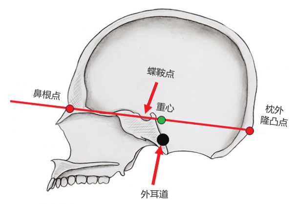 ● 颅骨倾斜角,由经过C7椎体中点的垂线和这个中心点与外耳道之间的连线所构成的夹角。常用来区分颈椎的伸展(下颈椎后凸状态和上颈椎前凸状态)和收缩(下颈椎前凸状态和上颈椎后凸状态)。