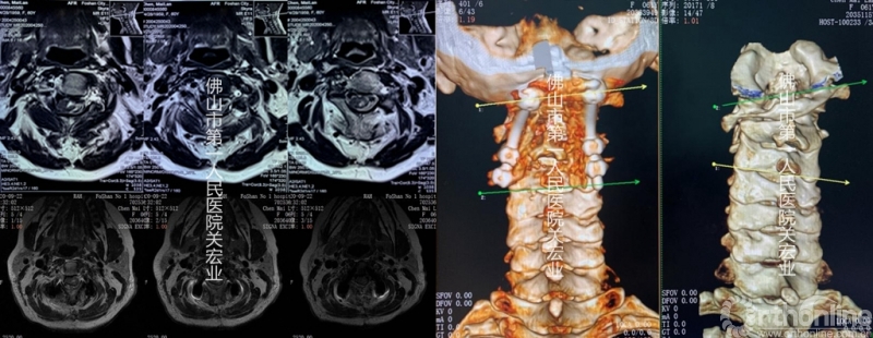 A:术后颈后、枕部向头顶的放射痛明显缓解。左上肢肌力提高一级,双侧下肢本体感觉改善。术前寰枢椎旋转脱位、下颌偏歪、齿状突上移、脊髓向右侧偏移的情况,术后影像学可见均有明显改善。