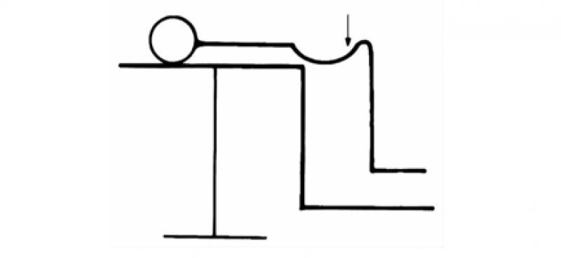 图20-15 腰椎前凸(箭头)的患者,难以维持正常的椎板-椎间盘位置关系