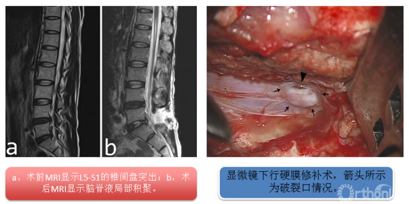 如果切口内出现清亮的液体,医生就应该想到硬膜破裂的可能。其它的可能包括:前一天行椎管造影引起的脑脊液漏、滑膜囊肿内的滑液、用湿纱布垫擦洗器械时残留在器械上的盐水滴落在切口内(当在显微镜放大6-9倍时,非常类似脑脊液)、由于硬膜外脂肪太多器械操作或牵拉时挤出的液体。以上四种可能是自限性的,无需处理。