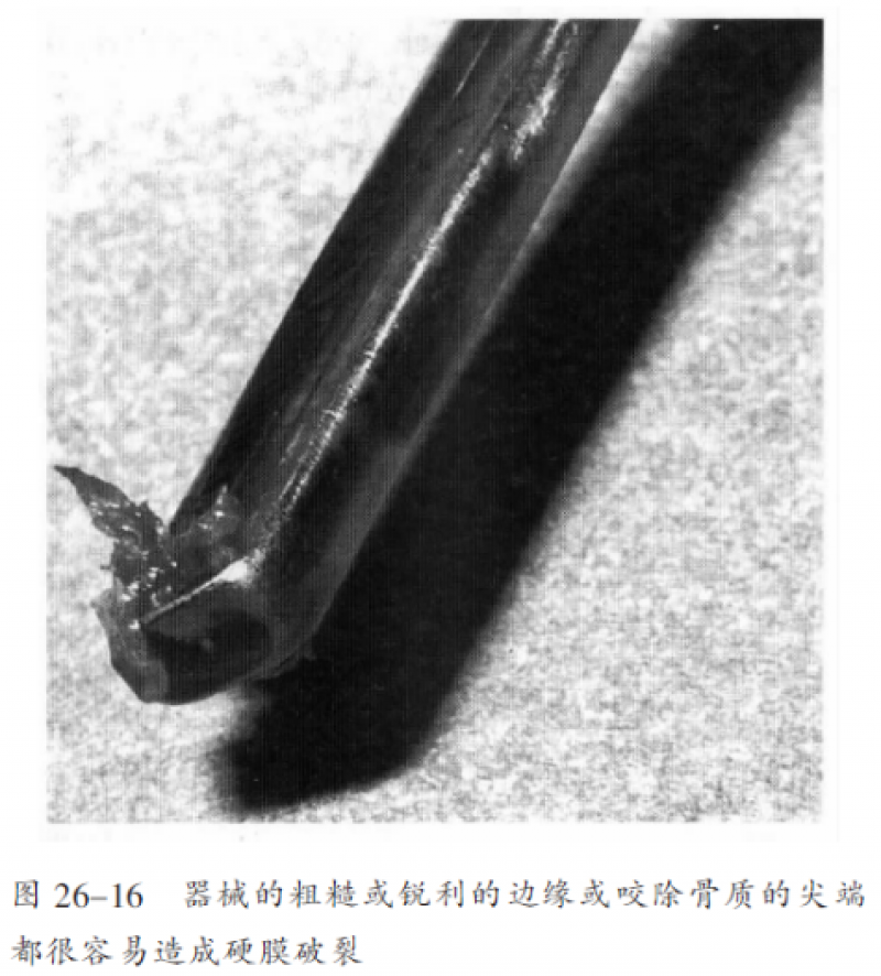 任何器械,只要靠近硬膜,就可能造成硬膜破裂:刀片可以切开硬膜、椎板咬骨钳可以咬破硬膜、刮匙可以撕破硬膜、探子可以刺破硬膜。认识到任何器械只要在硬膜周围操作都可能会造成硬膜破裂。手术中总要看清楚硬膜和整个器械的末端。
