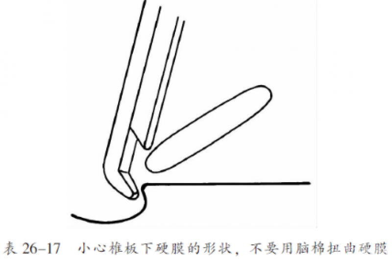 毋容置疑,处理硬膜破裂的最好的方法是避免其破裂。意识到硬膜破裂会发生,并仔细进行手术操作,确保有合适的手术器械,避免粗糙、带刺的器械接触硬膜(图26.16)。