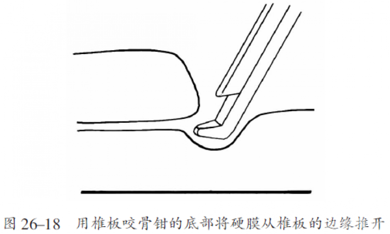 记住两个原则:(a)总要清楚椎板下硬膜的形状,并不要用脑棉片去扭曲它(图27.17);(b)当用椎板咬骨钳切除椎板时,总要用椎板钳的底面接触硬膜,然后咬除骨质(图26.18)。