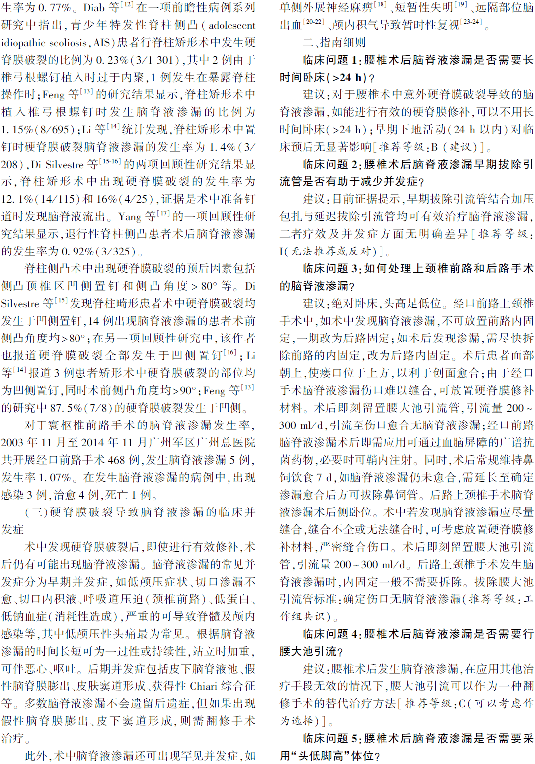 指南建议:腰椎术后发生脑脊液漏,在应用其它治疗手段无效的情况下,应用腰大池引流可以作为一种翻修手术的替代治疗方法。