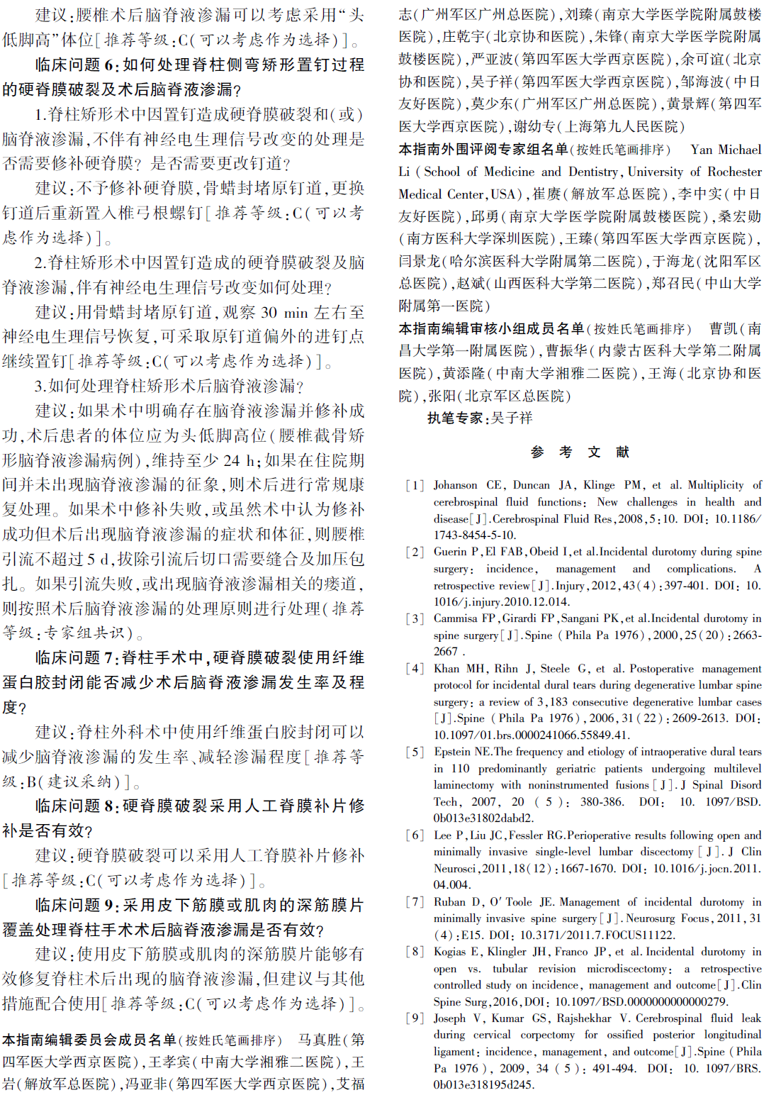 指南建议:使用皮下筋膜或肌肉的深筋膜片能够有效修复脊柱术后出现的脑脊液漏,但建议与其它措施配合使用。