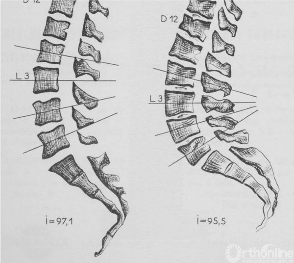在左侧的“静态”前凸,骶骨较高(垂直),骶骨终板更水平;在右侧的“动态”前凸,骶骨较低,骶骨终板更倾斜