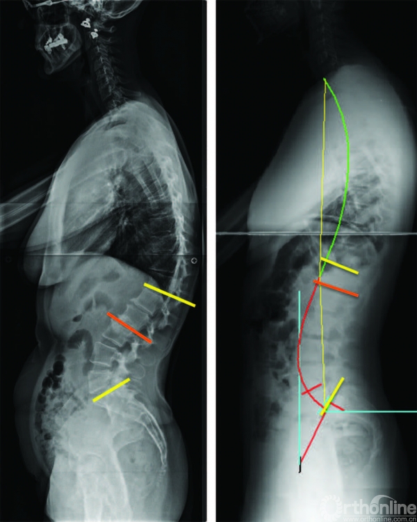 片中前凸长度的影响在左侧,有一个短节段腰椎前凸,前凸主要集中在少数几节脊椎。注意前凸曲线的上端在L3。在右边,有一个较长节段的腰椎前凸