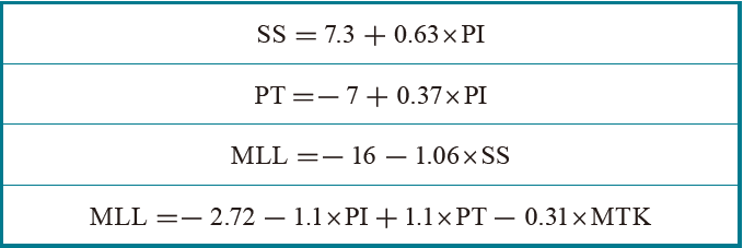 另一方面,“腰椎前凸的功能性分界”(也被称为“最大腰椎前凸角”)与骶骨倾斜角(R=0.86)的相关性更好,Roussouly等[12]发现了相似的结果,并且在较小程度上与PI(R=0.6)和PT(R=0.26)相似。他们建议使用“最大腰椎前凸角”作为腰椎前凸的值,并建议所有矢状位参数的计算方法均应基于相关性(表6-1)。