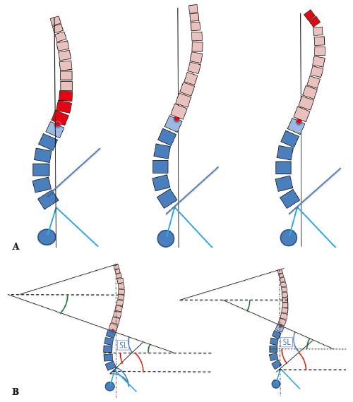 与解剖学概念仅考虑到角度变化不同,临界点概念还考虑到了脊柱弯曲在角度、长度和顶点位置上也有所不同的特点。我们建议称为脊柱后凸(SK)和脊柱前凸(SL)。