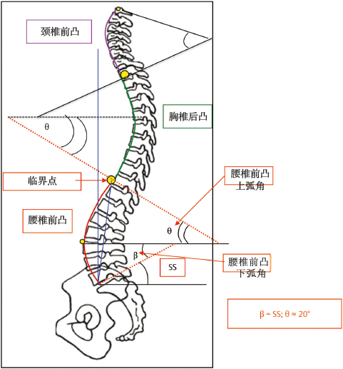 后凸和前凸之间临界点的位置、前后凸顶点的位置及腰椎前凸下弧角的弯曲度是决定矢状面形态的重要因素