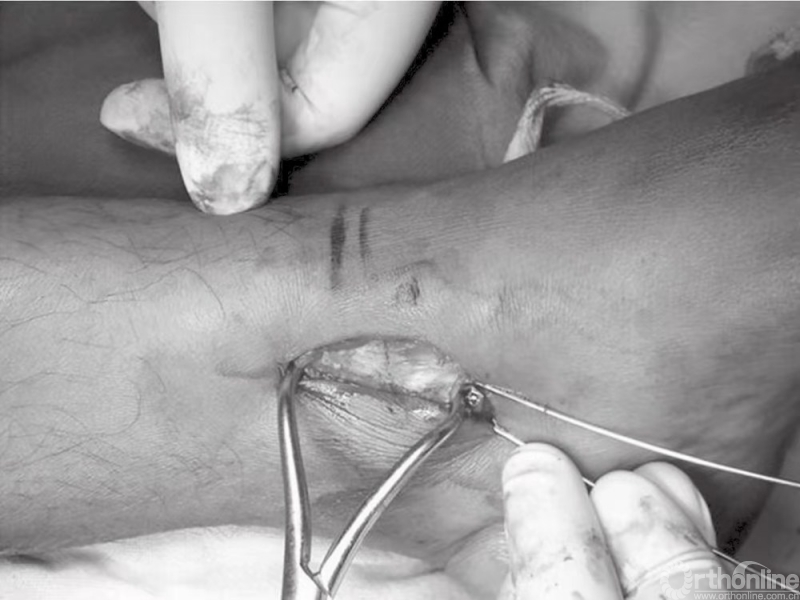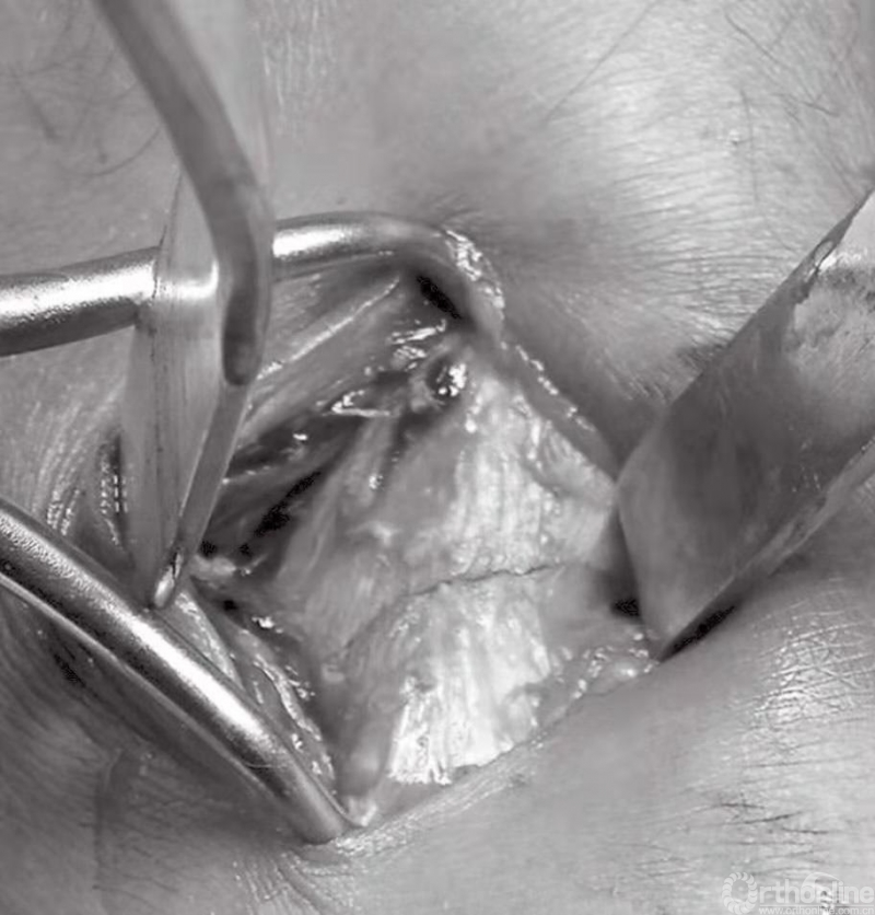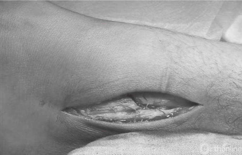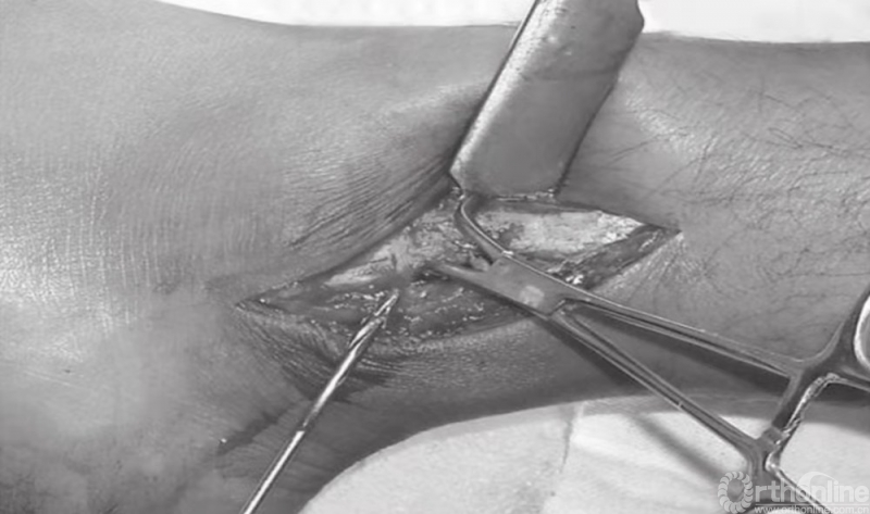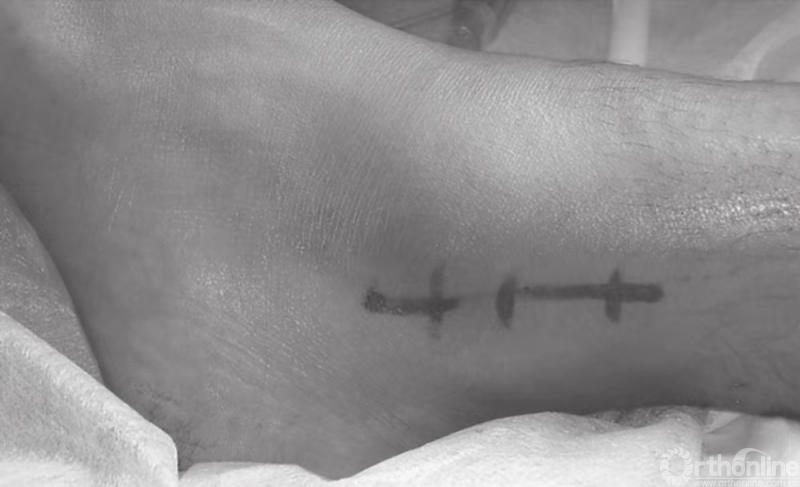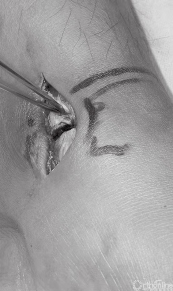 为避免神经瘤的形成,穿过腓骨远端的腓浅神经应得到保护。切开皮肤后,沿着切口线分开深筋膜(图3)。