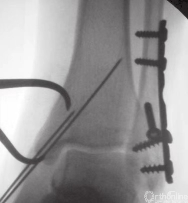 当后踝的骨折片涉及的关节面超过25%时,建议对该骨折片进行复位和固定。操作应在固定外踝前进行,因为腓骨的接骨板可能会阻碍视线,影响后踝骨折片的复位。