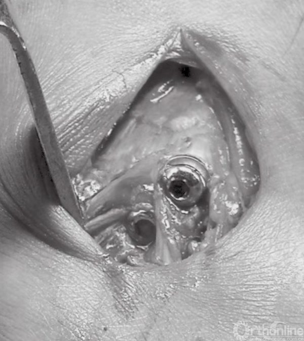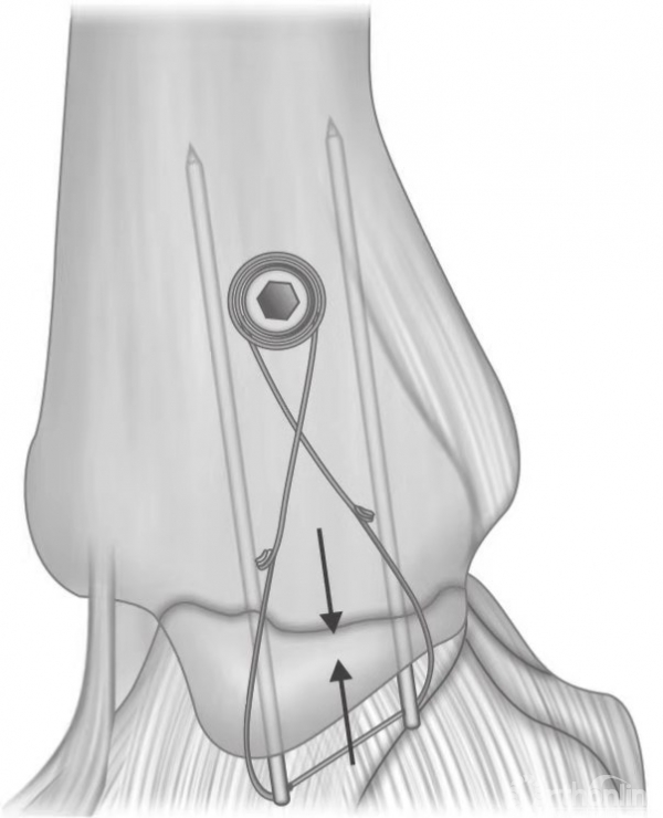 图21 内侧骨折片非常小,则固定时可用一枚螺钉和一枚克氏针或用两枚遵循静态张力带原理的克氏针