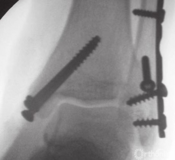 如果内踝发生纵向骨折或内收型损伤,则可能须将螺钉水平固定,以垂直于骨折线的方向,并可防止发生内踝剪切型移位。有时,也可使用较小的防滑移接骨板来增强螺钉的牢固性。