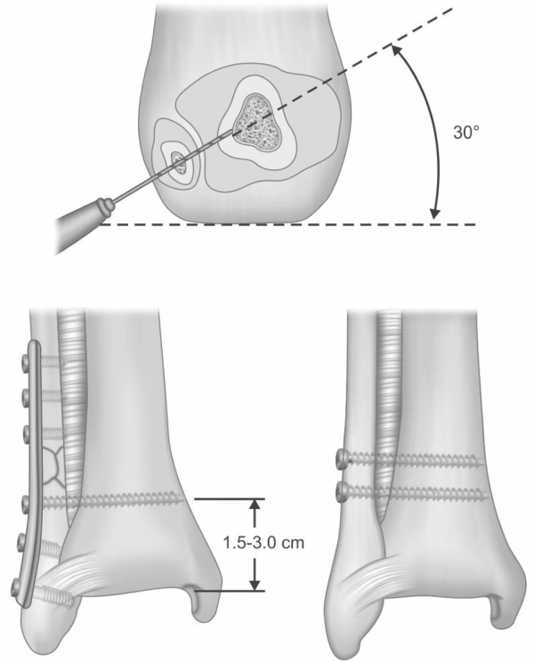 长螺旋形骨折可用两枚拉力螺钉和一块中和接骨板加以固定。骨折线的两侧最少须四皮质固定。较小的1/3或半形管状接骨板通常用于固定腓骨。3.5mm的动力性加压接骨板也被用于体型较大的患者。近期,用于腓骨固定的特制接骨板也被研发出来。