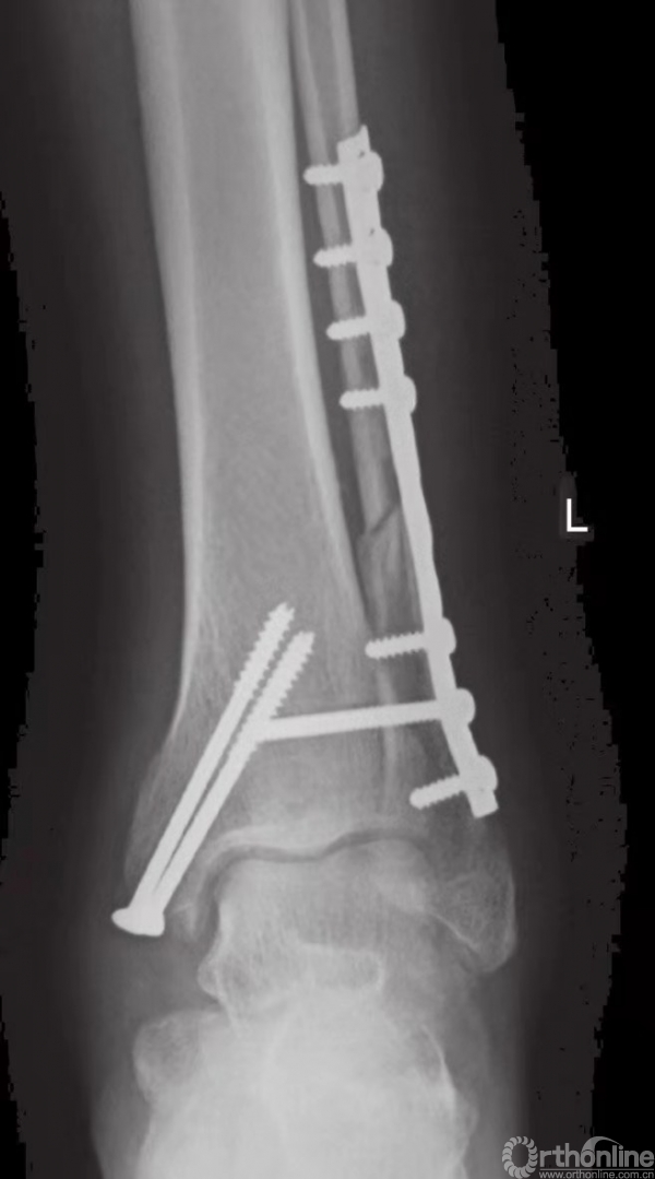 通常在10周之后取出下胫腓联合螺钉,随后患者开始完全负重。在开始负重前,一些外科医生更倾向于不取出下胫腓联合螺钉。但在这种情况下,须事先告知患者术后的负重可能会导致下胫腓联合螺钉破裂(图26)。