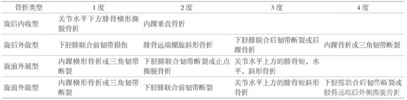 踝关节骨折一般有两种分类方法。Davis-Weber分类法根据腓骨骨折线的位置,将踝关节骨折分为A、B、C三型:A型中的骨折线在下胫腓联合以下,B型中的骨折线经下胫腓联合,而C型中的骨折线在下胫腓联合之上。Lauge-Hansen分类法的根据则是足在受伤时的位置以及暴力下距骨旋转的方向(表1)。