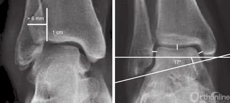 为识别骨折线、关节半脱位以及可能的下胫腓联合损伤,须具备高质量的踝关节前后位片、踝穴位片和侧位片。在踝关节的前后位片中,内侧、外侧和上方的关节间隙应该等大。内侧的关节间隙实际应小于4mm,如果大于4mm,则表明外侧距骨半脱位。腓骨远端的内侧面应延伸至距骨的关节边缘。距骨小腿角间接测量了腓骨的长度,度数应为83±4度。正常情况下,下胫腓的关节间隙为4mm,如果大于6mm,则表明下胫腓联合断裂。在前后位片中,腓骨远端与胫骨远端会出现约6mm的重合影(高出关节线1cm)(图1)。